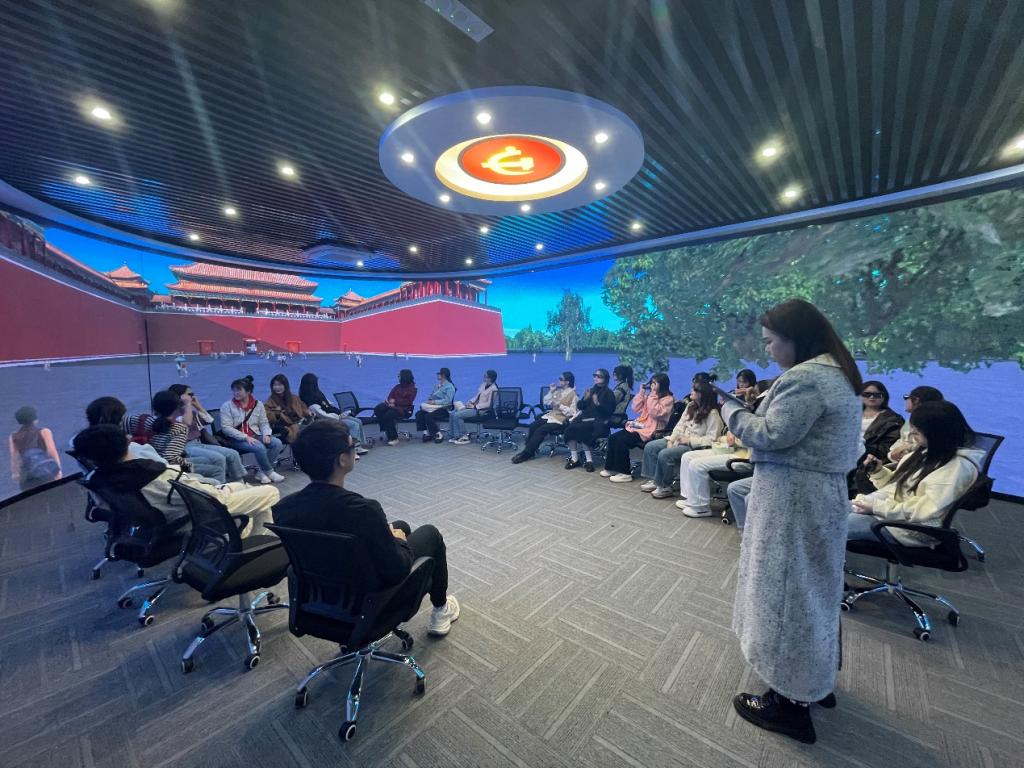 在党建思政馆,思政部教师谢孝红引导同学们通过参观图文展、体验360°全沉浸式教学,在中国共产党百年奋斗的光辉历程中,感悟党史中的卫生健康事业;在虚拟与实践的互动交流中,读懂中国共产党人为中国人民谋幸福、为中华民族谋复兴的初心使命。