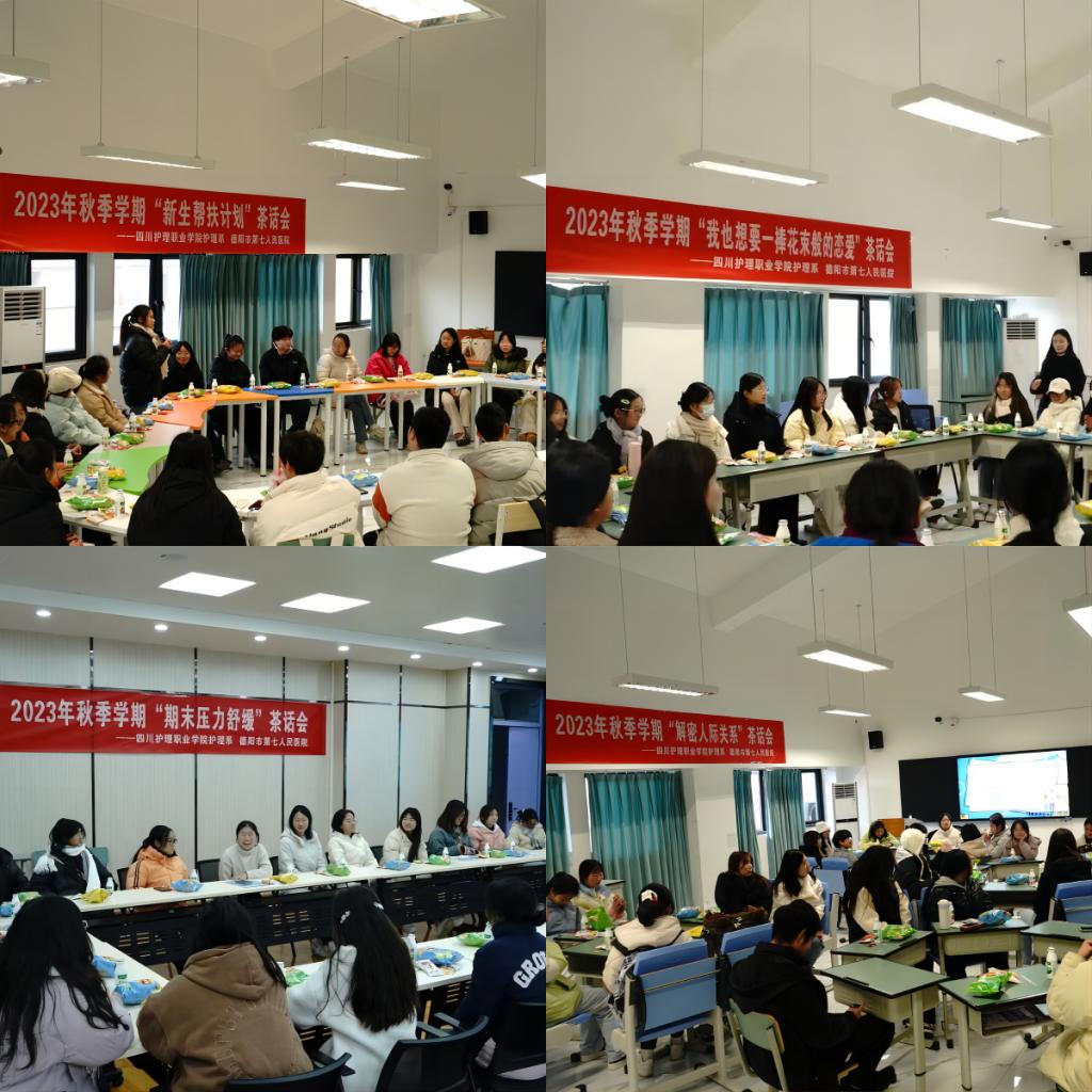 本次系列茶话会邀请德阳市第七人民医院杨晓斌、罗彦、谢晓倩、徐坤宇等专家,围绕“新生帮扶计划”“我也想要一捧花束般的恋爱”“期末压力舒缓”“解密人际关系”等内容,聚焦新生学习、技能竞赛、职业规划、情感恋爱、压力缓解、人际交往等问题,以轻松、自由的方式为学生排忧解难,引导学生用积极正确的心态面对问题、分析问题、解决问题,帮助学生树立正确的世界观、人生观、价值观。
