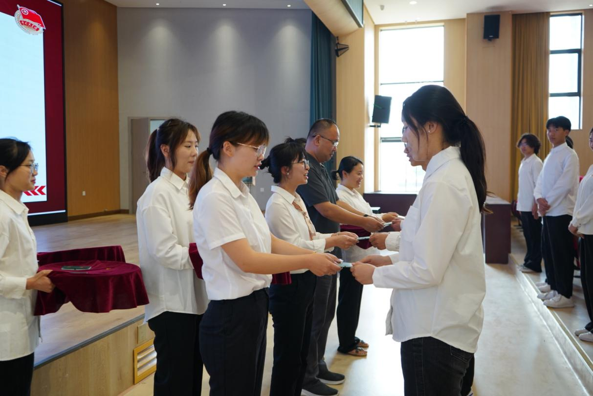 入团仪式在国歌声中拉开序幕。首先,优秀团员代表袁晓强宣读新团员名单;与会领导和老师逐一为新团员们佩戴团徽徽章并颁发团员证。