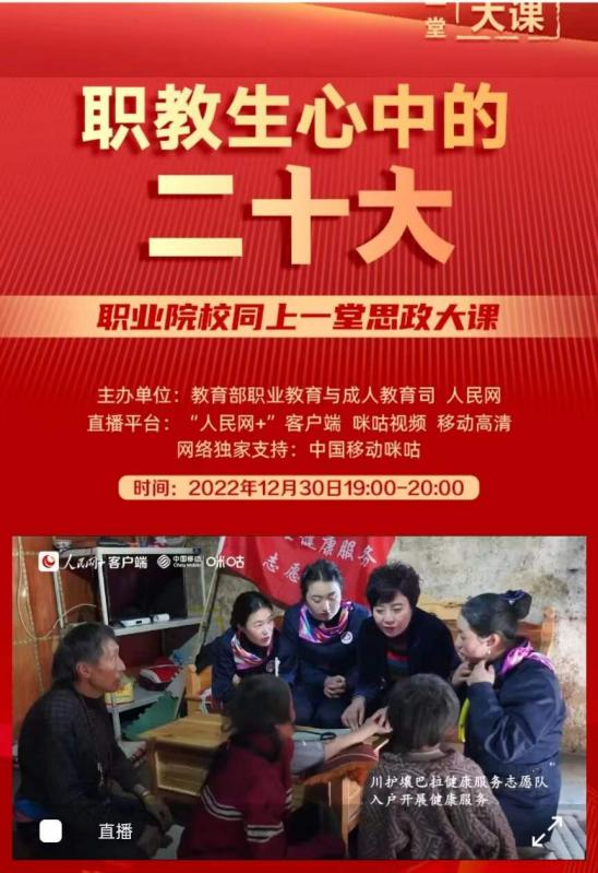为展现新时代职教青年理想、追求与探索,感受新时代职教人对职业教育的理念和情怀,引领青年学生增强对职业教育的自信心和自豪感。12月30日,beat365官方网站师生观看了由人民网联合教育部职教司推出的职业院校“同上一堂思政大课”课程。学院党委副书记、院长,全国教书育人楷模、第七届全国黄炎培职业教育杰出校长、教育部全国高校学习宣传党的二十大精神师生巡讲团成员张先庚教授受邀作题为“扎根基层 卫生报国 让青春绚丽之花绽放在祖国最需要的地方”主旨报告,来自全国职业院校师生及川护1.2万名师生在线上观看。
