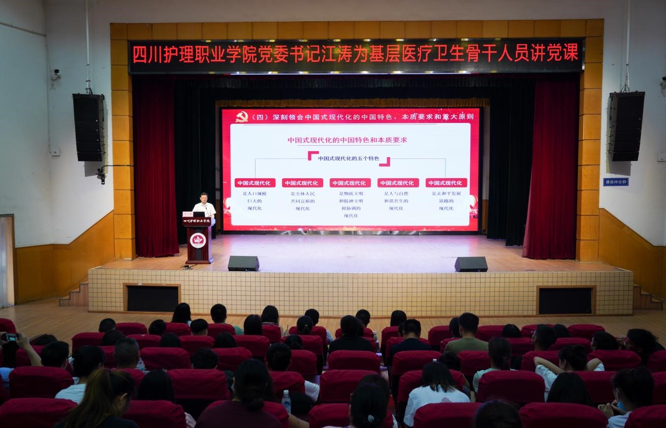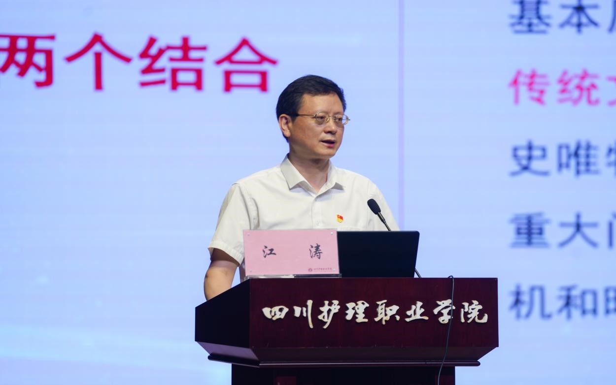 江涛在党课中对党的二十大报告主题、主要内容进行宣讲,对新时代十年变革中卫生健康事业伟大成就、中国式现代化所体现的中国特色和本质要求,以及如何更好把握好习近平新时代中国特色社会主义思想世界观和方法论进行了阐释。他结合自身在省卫生厅的工作经历生动讲授了四川卫生健康事业十年改革成就,通过详实案例充分展示了学院近年来推动民族地区的医疗卫生事业发展的具体实践。