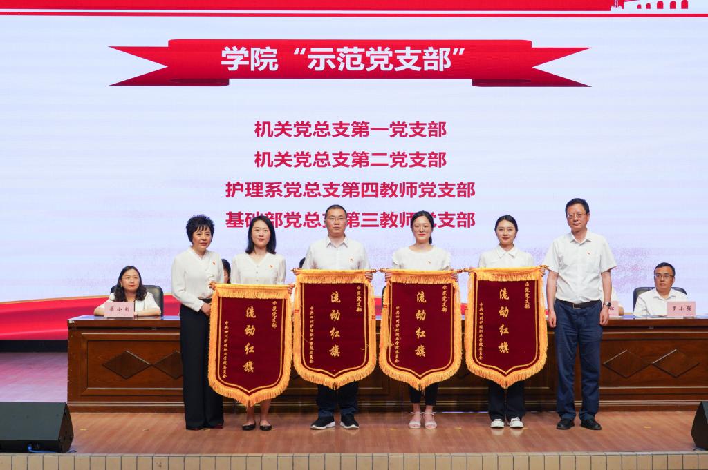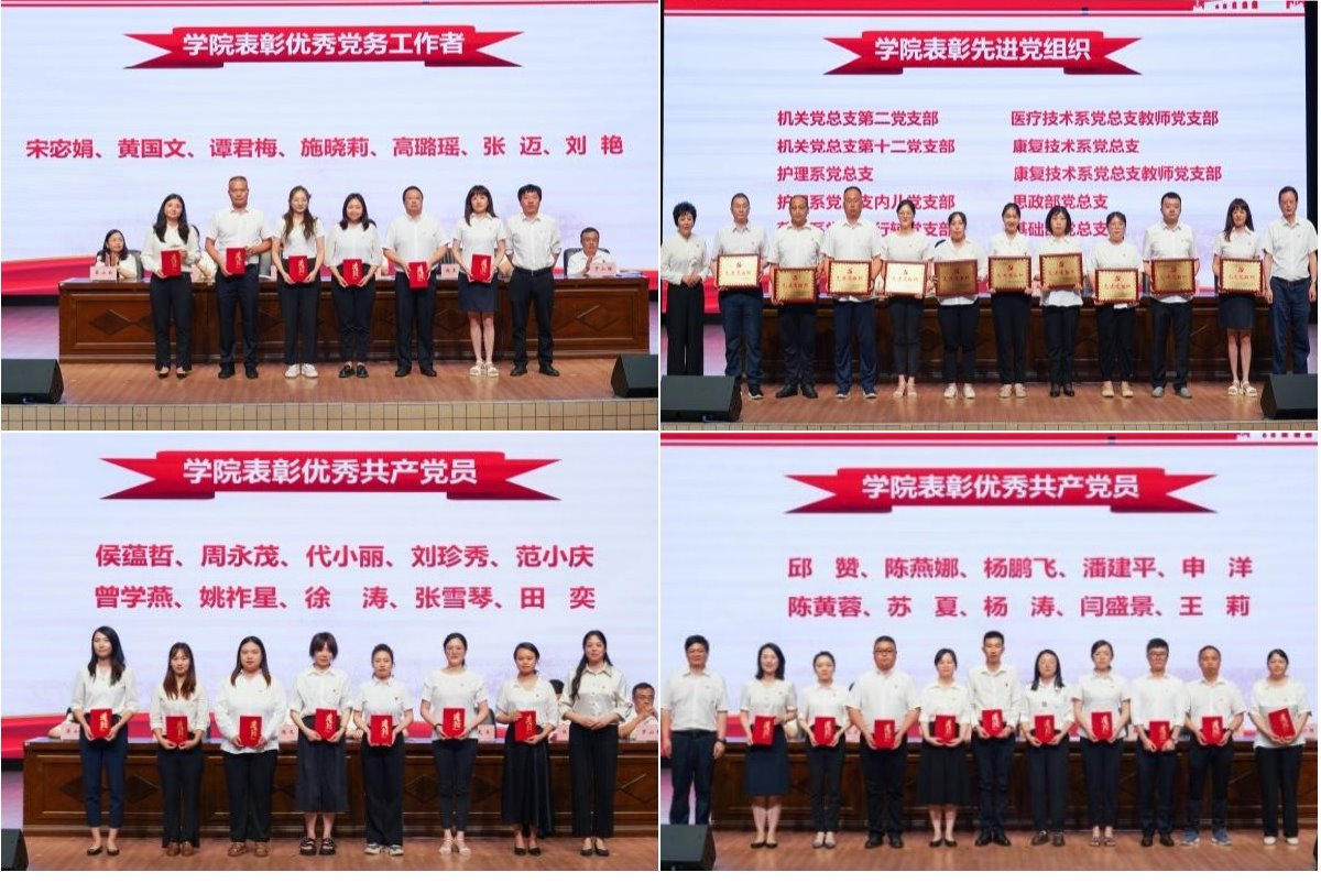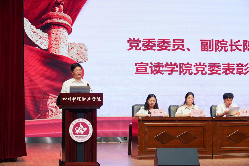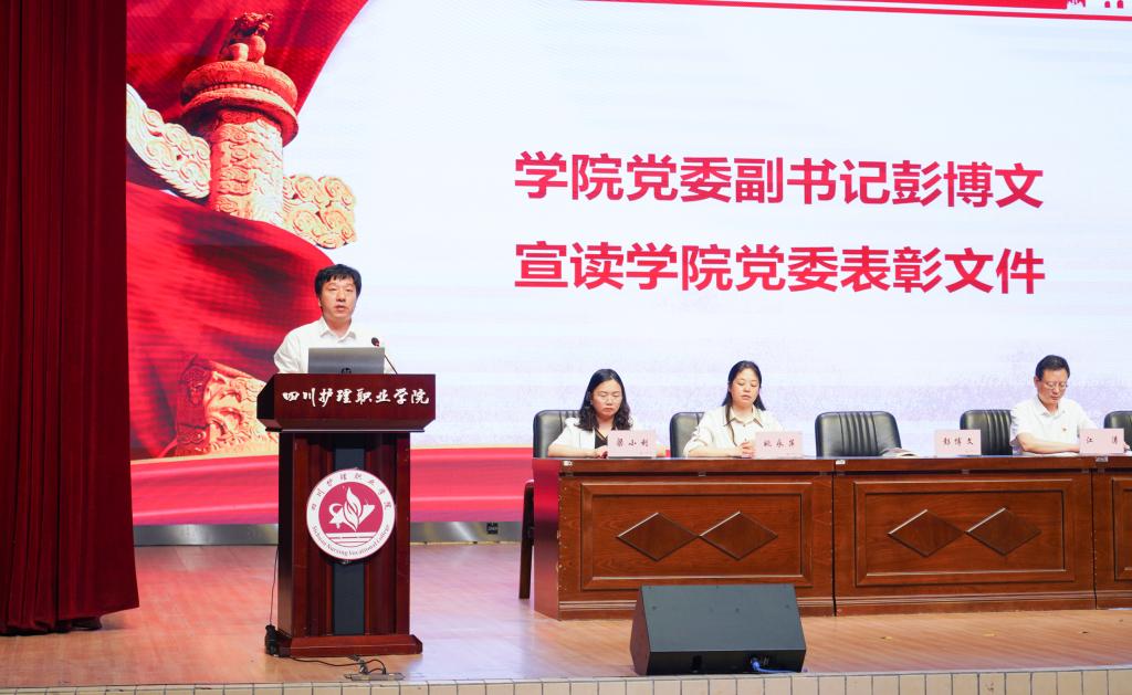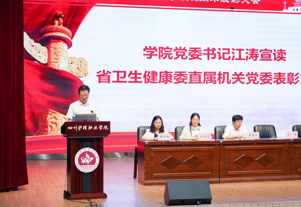 学院党委书记江涛宣读《中共四川省卫生健康委直属机关委员会关于表彰优秀共产党员、优秀党务工作者、先进基层党组织的决定》。学院党委副书记彭博文宣读《中共beat365官方网站委员会关于表彰优秀共产党员、优秀党务工作者和先进党组织的决定》。院领导分别为获得学院党委表彰的先进集体和个人代表颁奖。