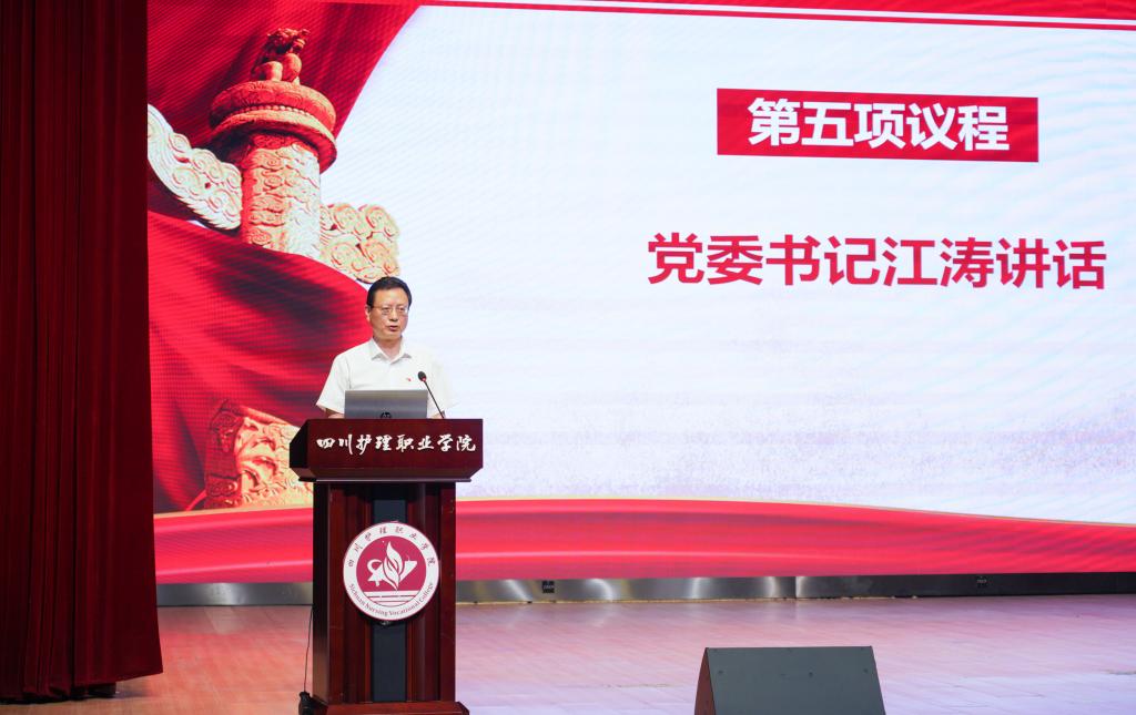江涛书记在总结讲话中,代表学院党委向受表彰的先进集体和个人表示热烈祝贺,向全院党员致以节日问候。他回顾建党102年的光辉历程和新时代10年的伟大成就,总结今年以来学院的党建工作,并对暑期和下半年重点工作进行安排部署。江涛书记要求各级党组织要扎实深入开展主题教育;继续抓实基层党建工作;持续加强干部队伍建设;不断继续强化宣传思想、意识形态和安全稳定工作。江涛强调,新时代肩负新使命,新使命召唤新作为。全体党员干部要以“时时放心不下”的责任感和积极担当作为的精气神,踔厉奋发、勇毅前行,攻坚克难、砥砺奋进,以高质量党建引领学院各项事业高质量发展,为推进教育强国、教育强省,健康中国、健康四川建设贡献“川护”力量。