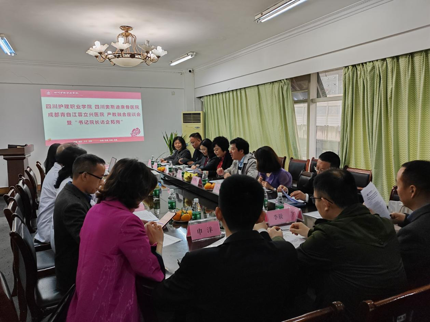 副院长梁小利,学生工作部、招生就业处、学科科研处/产教融合办公室、护理系、药学系、医疗技术系、康复技术系相关负责人随同调研,四川奥斯迪康骨医院行政副院长何进师、副院长宋国菊、副院长宋学敏、护理部主任等参加座谈。