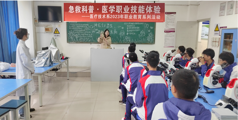 为深入贯彻落实党的二十大精神和习近平总书记关于职业教育的重要指示批示精神, 大力宣传普及医学知识,弘扬劳动光荣、技能宝贵的时代风尚,5月9日,医疗技术系党总支在成都校区开展急救科普暨医学职业技能体验活动,为龙泉第二中学学生宣讲急救知识技能、普及寄生虫预防知识。医疗技术系党总支书记、副书记、党员代表参加活动。