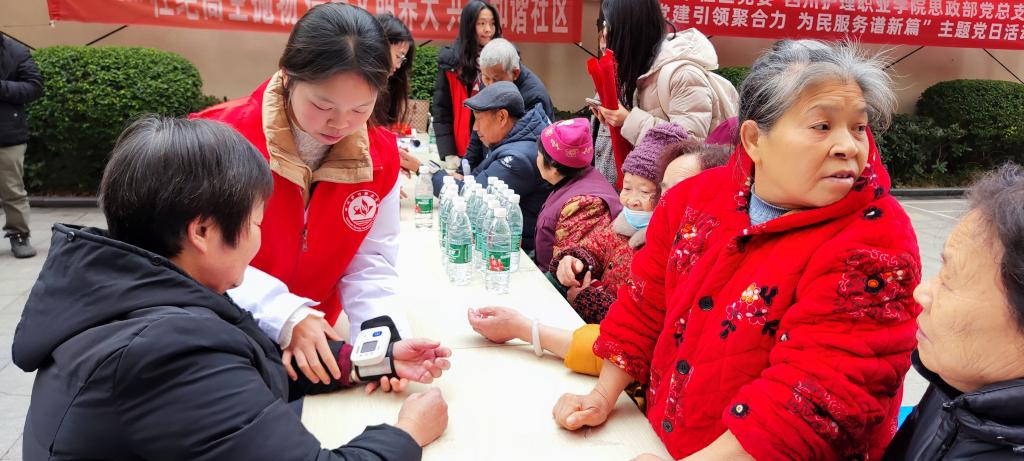 本次主题党日活动在兴唐·中心城小区广场拉开帷幕,内容丰富多样:党支部杨梅用通俗易懂的语言宣讲了党的二十届三中全会精神;医疗技术系学生结合老年人常见的白内障、青光眼等眼部疾病开展了健康用眼知识科普;康复技术系教师严茜带领社区居民活动筋骨,练习传统功法;最受欢迎的党史知识有奖答题、保健按摩和血压测量环节,居民们参与度高,活动受到社区居民的广泛赞誉。